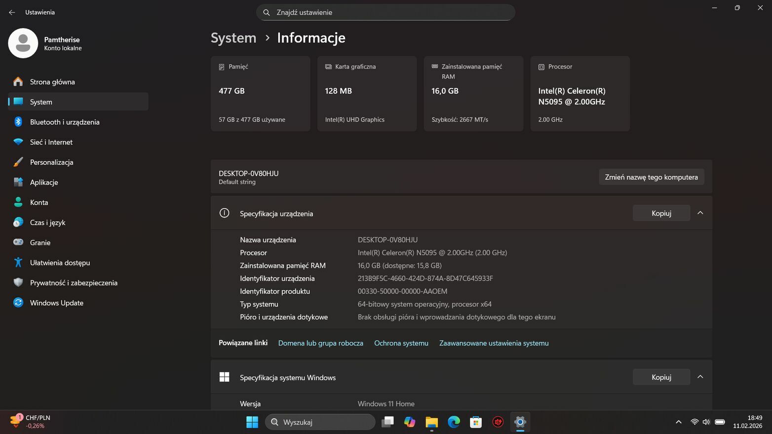 Procesor: Intel Celeron N5095 (4 rdzenie, do 2.9 GHz)